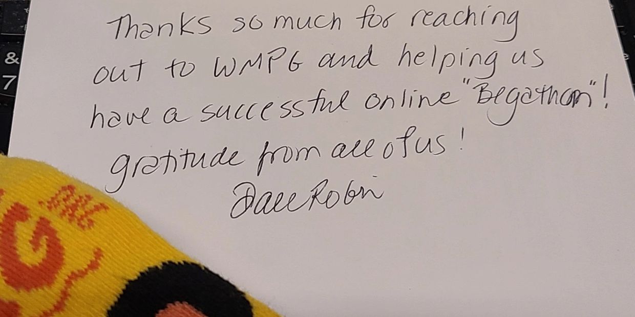 Thank you note and pair of record album socks from community radio station WMPG, in return for our partnering on screenings of "WBCN and The American Revolution" to help provide station with critical funding during coronavirus shutdown and facilitating discussion on the importance of community radio and how media can create social change.